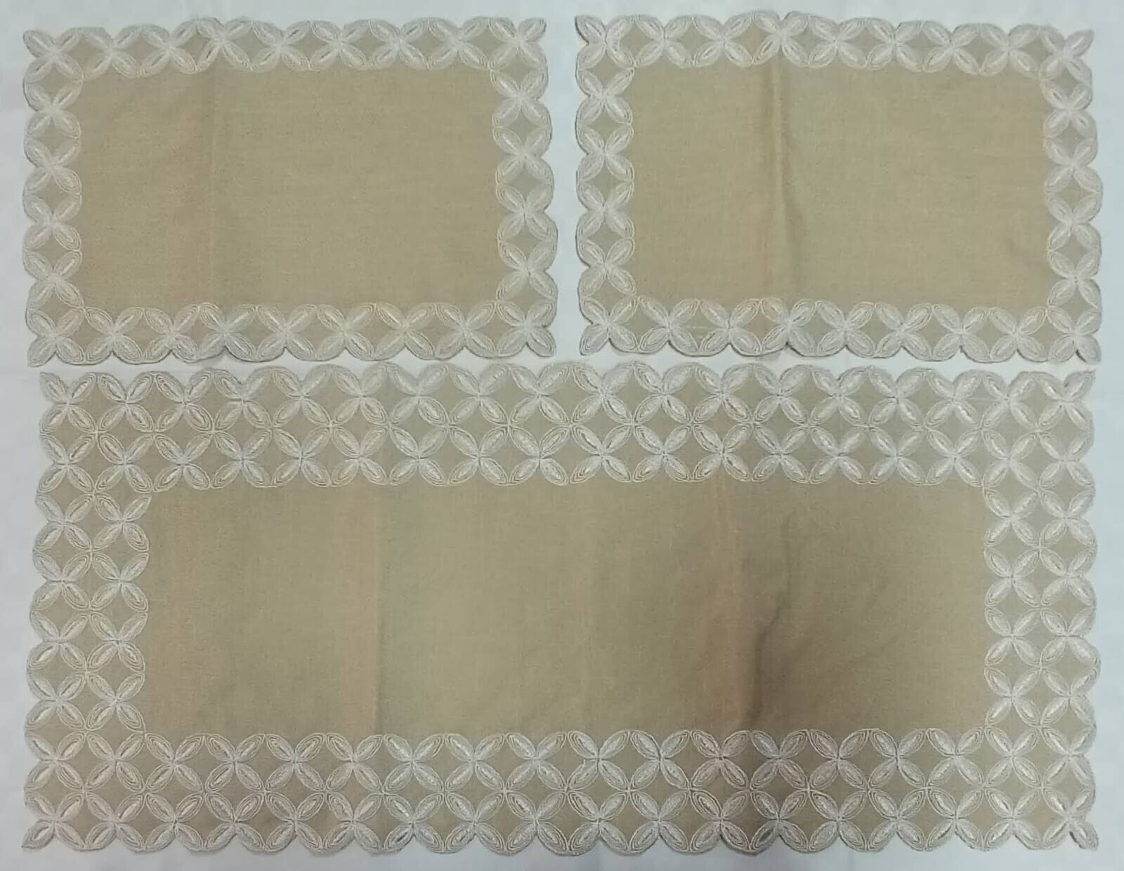 Elegante e ricercato tris di centrini composto da un runner grande 86x40cm e due centrini più piccoli 43x29cm. In Tinta unita con semplice ricamo ai bordi.