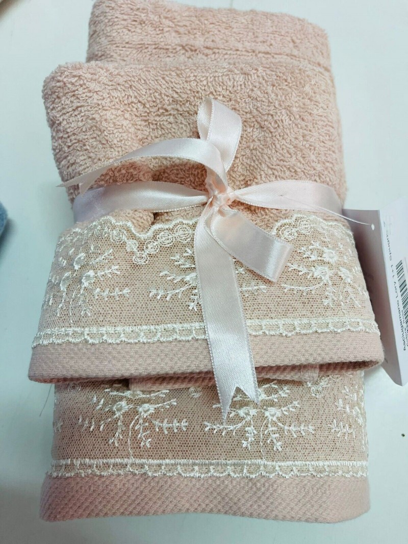 viso ed 1 ospite in spugna di puro cotone idrofilo, tinta unita con fascia lavorata. Disponibile in vari colori quali celeste, grigio, panna, rosa, sabbia, verde acqua.