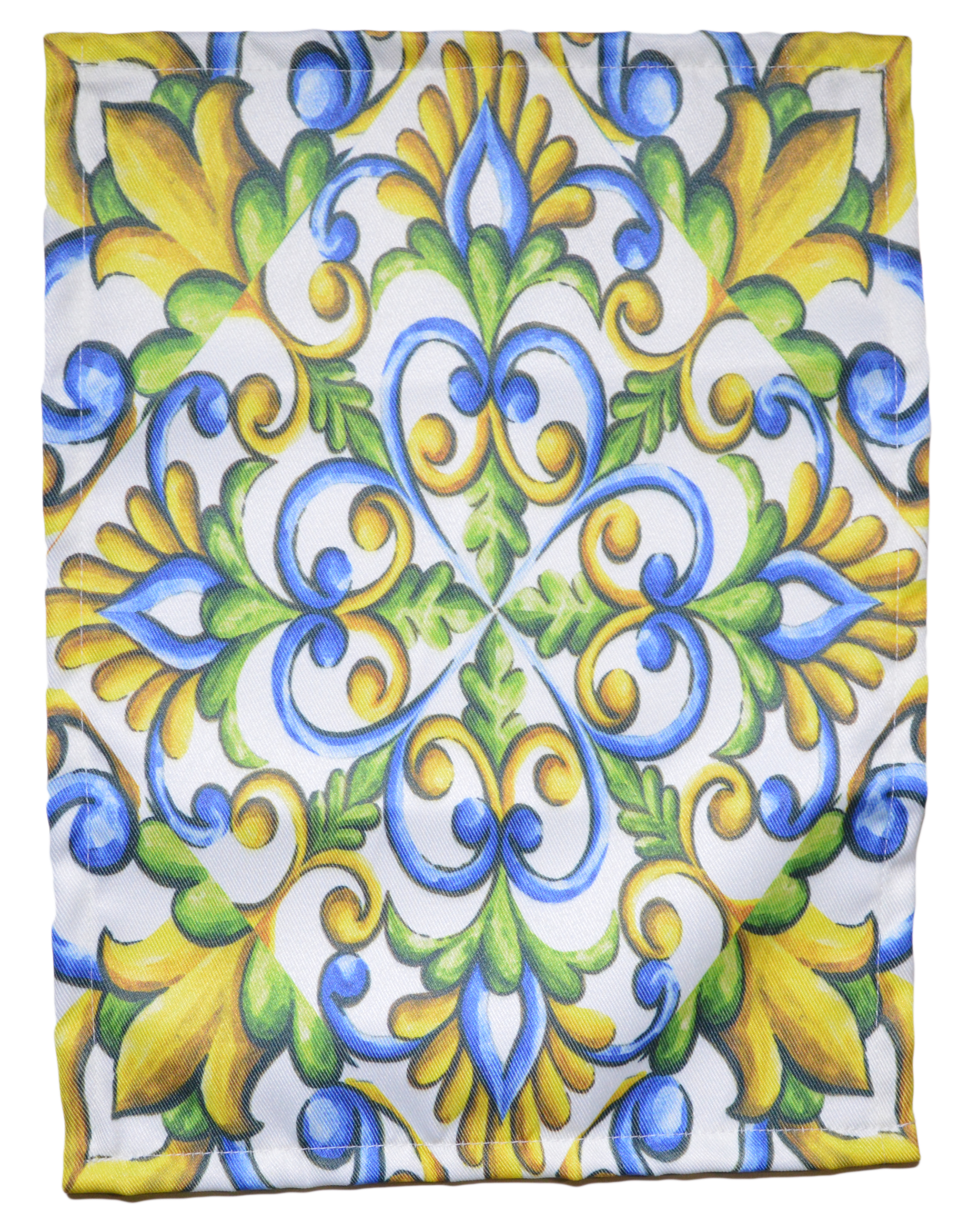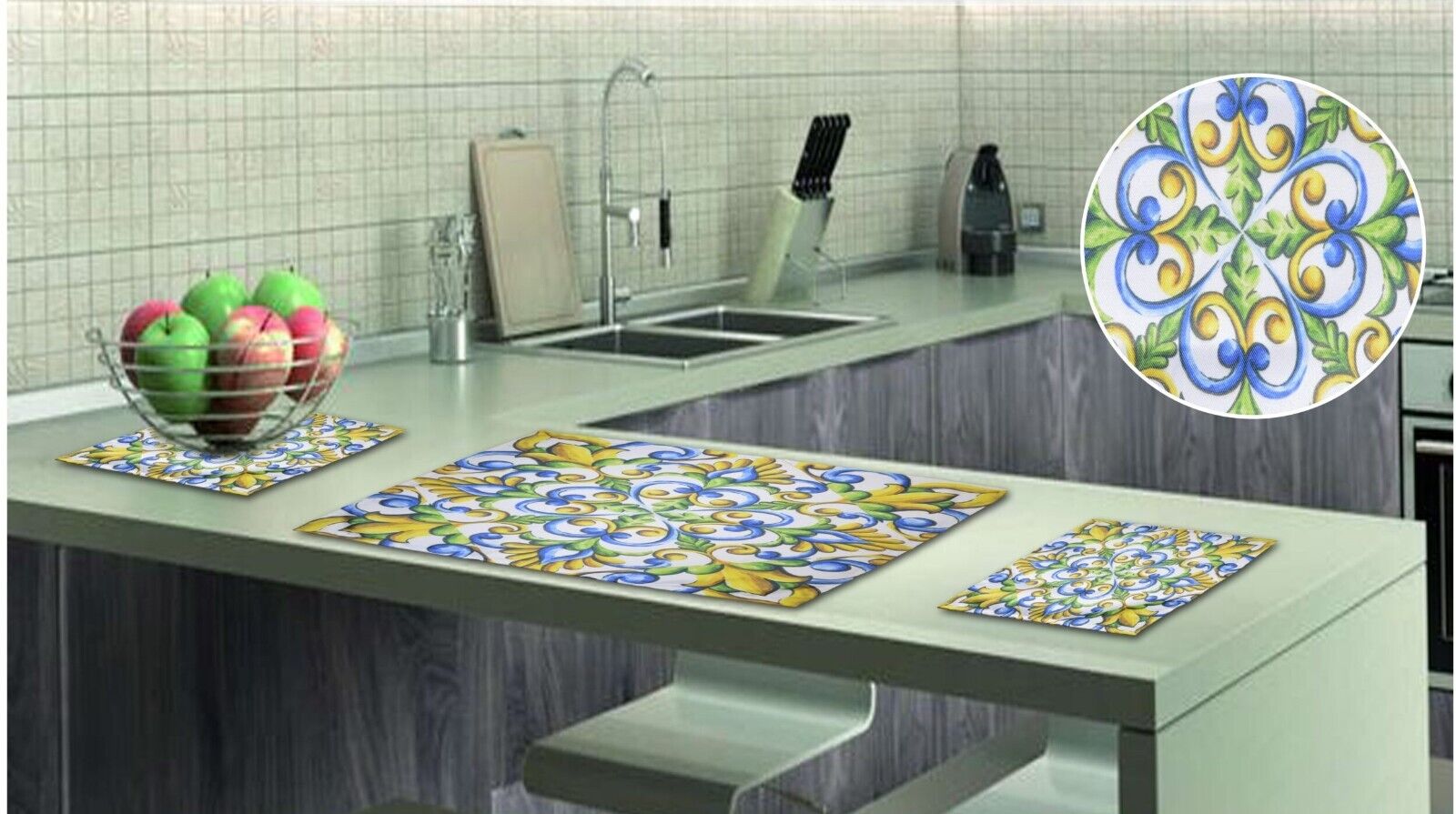 Tris di centri composto da due piccoli e uno grande in cotone, fantasia maioliche che conferiscono buon umore alla tua stanza. Misure centro grande 40x70cm mentre i due centri piccoli = 30x40cm.