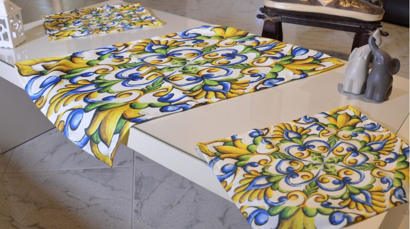 Tris di centri composto da due piccoli e uno grande in cotone, fantasia maioliche che conferiscono buon umore alla tua stanza. Misure centro grande 40x70cm mentre i due centri piccoli = 30x40cm.