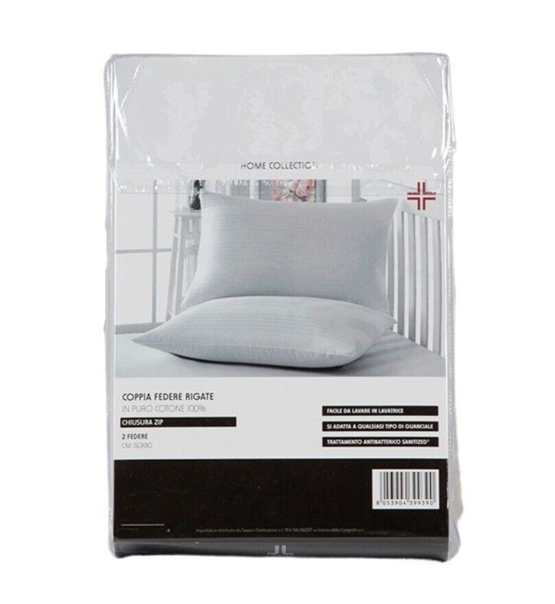 Coppia di federe rigate con chiusura cerniera laterale, realizzate in puro cotone 100% igienico e traspirante. Ideali per proteggere il tuo guanciale da polvere e impurità dell'aria. Con trattamento antibatterico sanitized. Qualità extra ed adattabili ad ogni tipo di guanciale. Per una miglior conservazione della coppia di federe lavare a max 40°.Misure: 50x80.