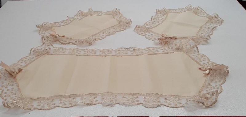 Tris di centrini composto da un centro grande 40x70cm e due centrini più piccoli 30x40cm. Realizzati con materiale di alta qualità. Ideati realizzati e prodotti dalle manifatture italiane.