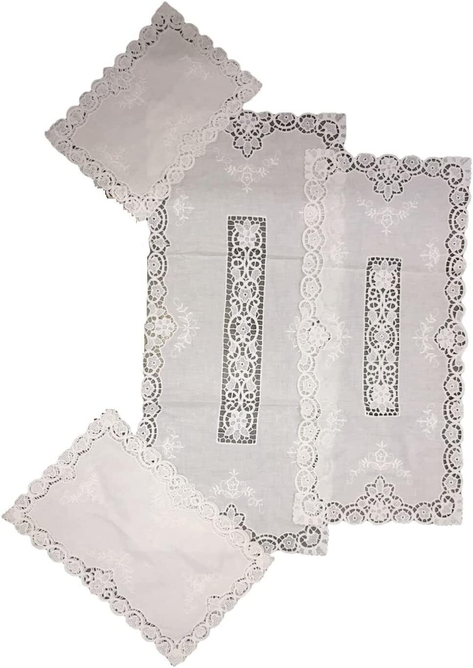 Esclusivi centrini, lavorazione artigianale produzione interamente italiana, in tinta unita con fondo floreale si abbinano sia ad un arredamento classico che moderno. Il set di centrini è perfetto in camera da letto, ma anche sui mobili, su una consolle o su un tavolo da salone