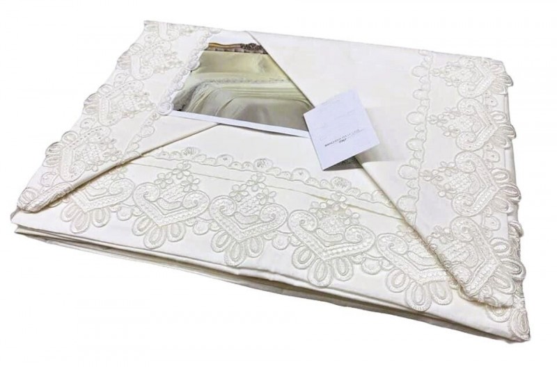I colori disponibili sono: panna e bianco. Il lenzuolo presenta un'organza ai bordi.