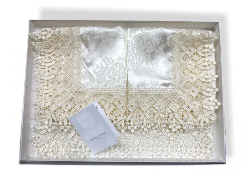 Tris di centrini, Carla, composto da un centro grande 40x70cm e due centrini più piccoli 30x40cm. Realizzati con materiale di elevata qualità.