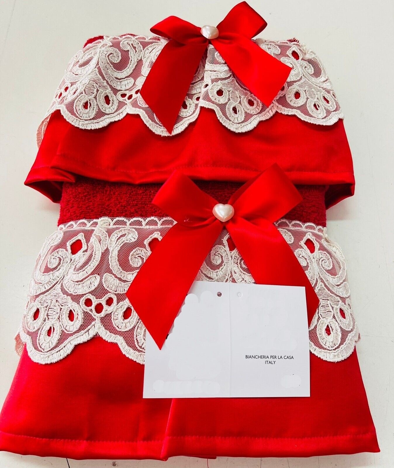 Elegante e ricercata coppia di asciugamano 1+1 Ospite in tinta unita di colore rosso, con balza in raso e con applicazione di pizzo rebrodé . Ottimo anche come idea regalo!