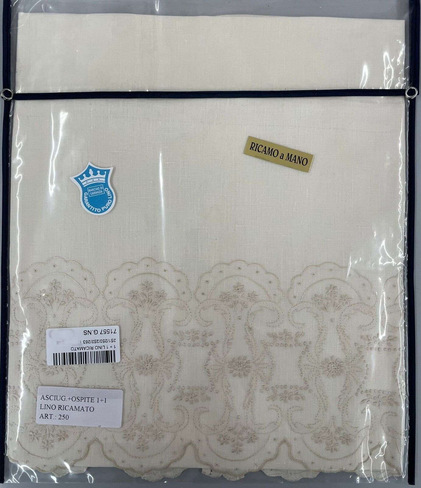 Asciugamano 70x105cm Puro Lino Coppia 1piu'1 Ospite 35x55cm Ricamo a mano Ecru'