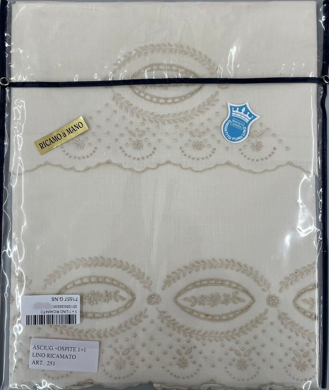 Questa pregiata Coppia 1+1 asciugamano è composto da 1 asciugamano viso ed 1 ospite in puro lino ricamo a mano colore ecrù, 3 disegni disponibili. Le misure sono asciugamano  70x105 cm; ed Ospite 35x55cm.
