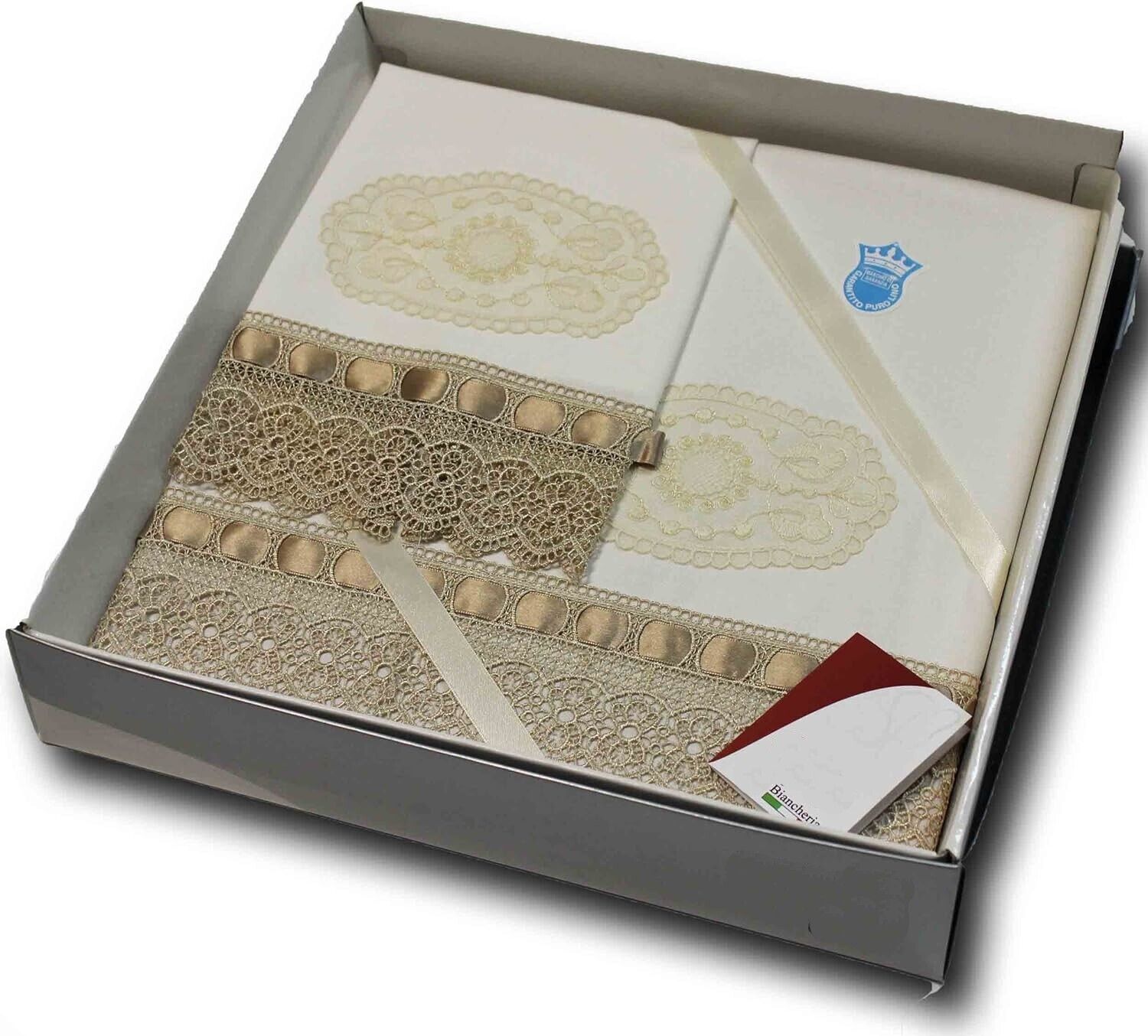 Coppia di asciugamani in puro lino 100% di colore beige con ricamo al Macramè e passanastro e ricamo centrale in Organza