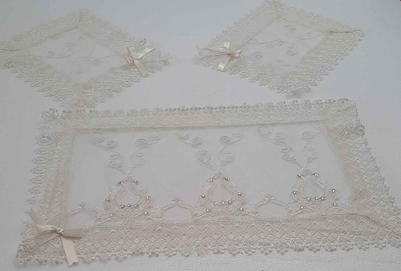 Elegante e ricercato tris di centrini composto da un centro grande 40x70cm e due centrini più piccoli 30x40cm. Realizzati con materiale di alta qualità. Disponibili nel colore del panna.