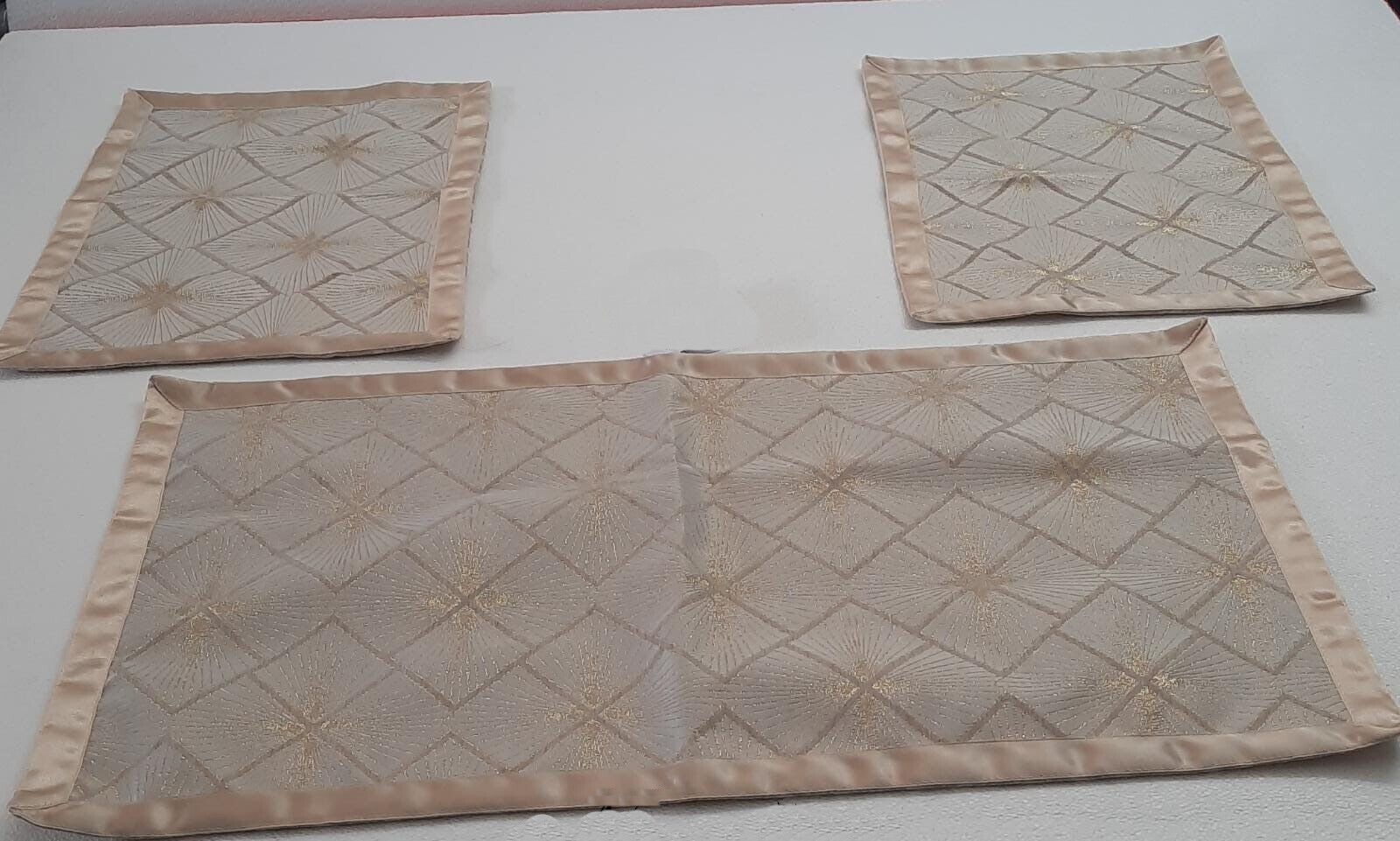 Elegante e ricercato tris di centrini composto da un centro grande 40x70cm e due centrini più piccoli 30x40cm. Realizzati con materiale di alta qualità. Disponibili in vari colori quali: oro e grigio. ART. PELLO