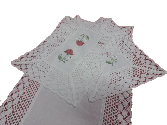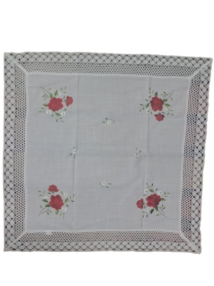 Centro Tavola Tris Centrini Runner Cotone Misto Lino Bianco Ricamo Rose Rosse