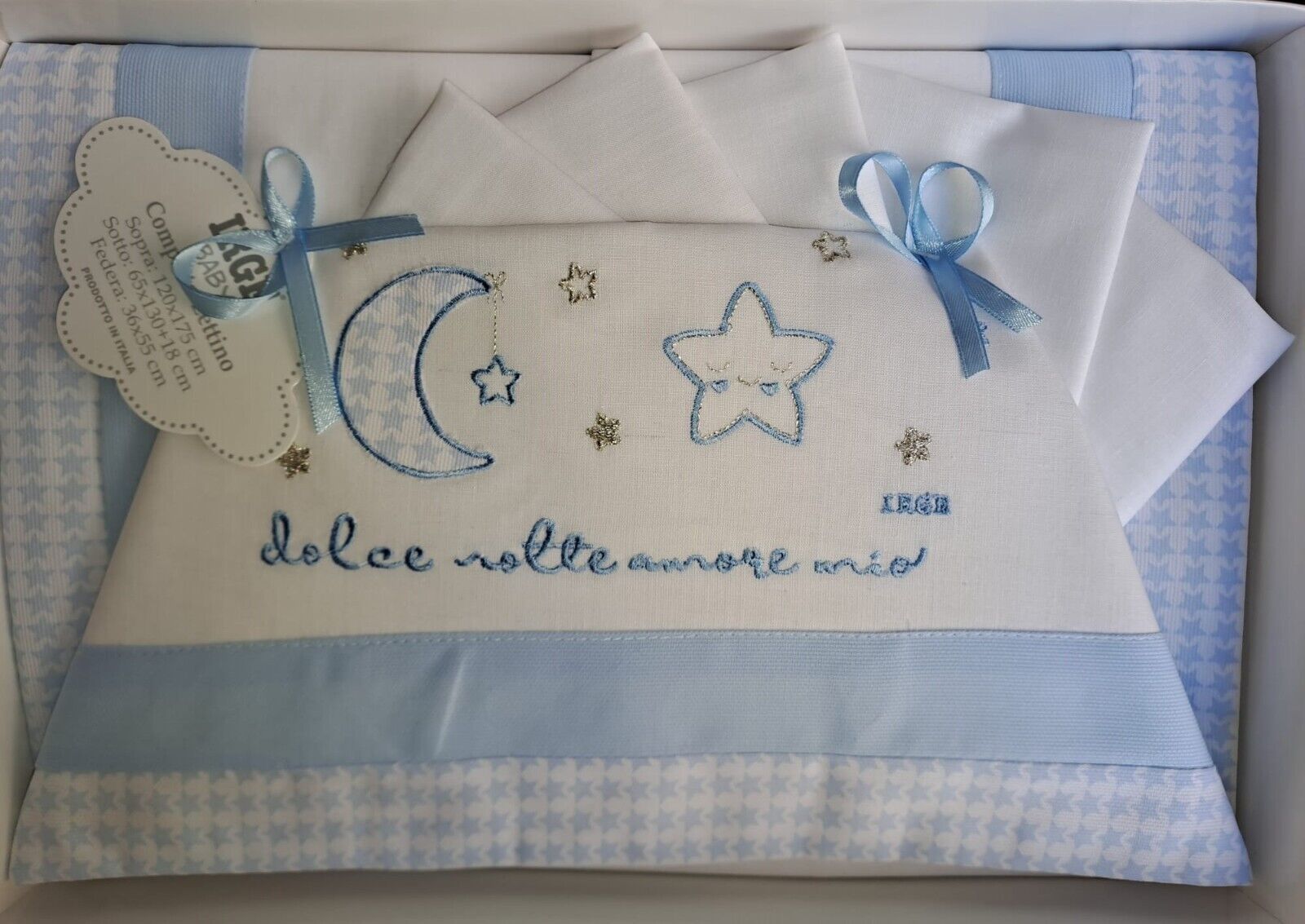 Completo lenzuola matrimoniale sopra, sotto e federe. Le misure sono: Sopra 120x175 cm; Sotto 65x130+18cm; Federa 36x55 cm.