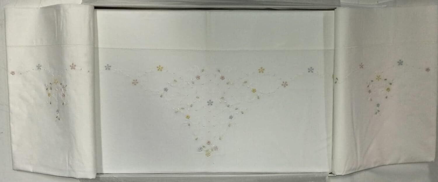 Completo di lenzuola con particolari disegni ricamati. 100% cotone, prodotto di alta qualità, colore bianco.