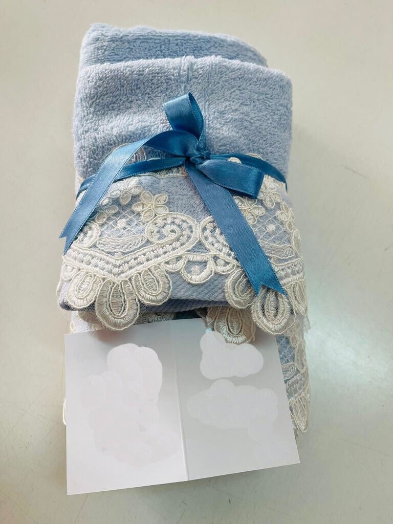 Coppia di asciugamano piu' ospite in puro cotone extra con un elegante e raffinato pizzo macramè. Disponibile in vari colori.