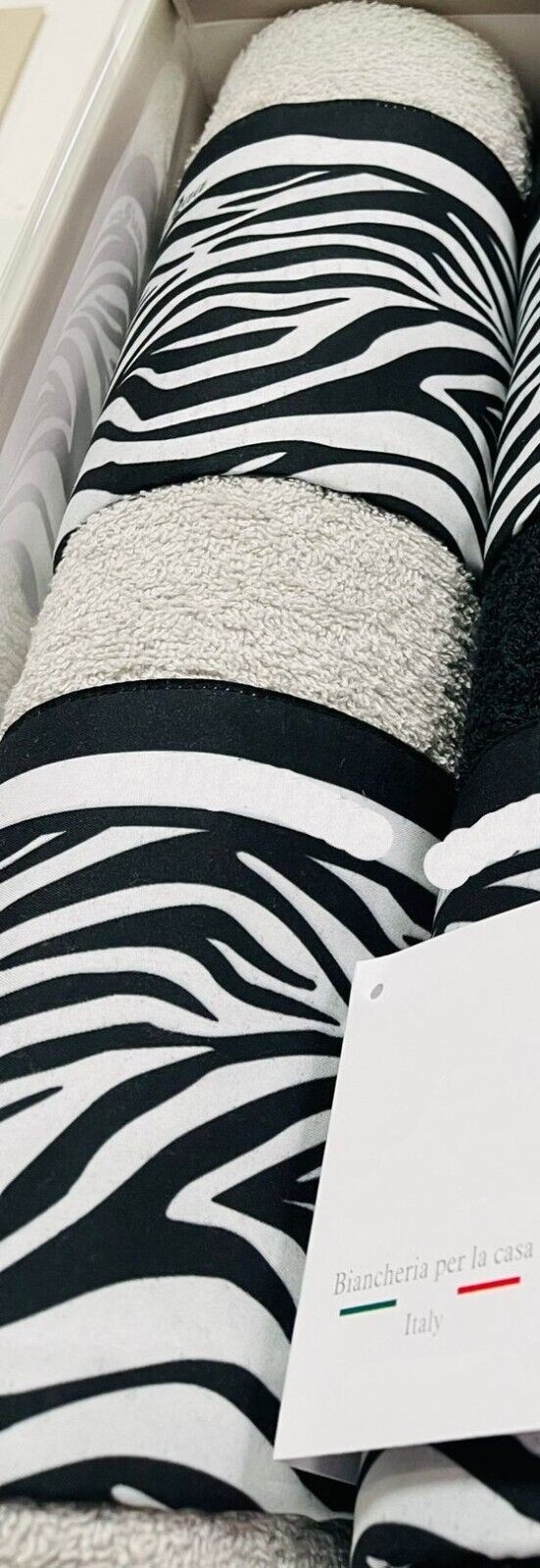 Elegante e ricercata coppia 1+1 asciugamani + Ospite, in Spugna di puro Cotone, tinta Unita con fantasia zebrata.