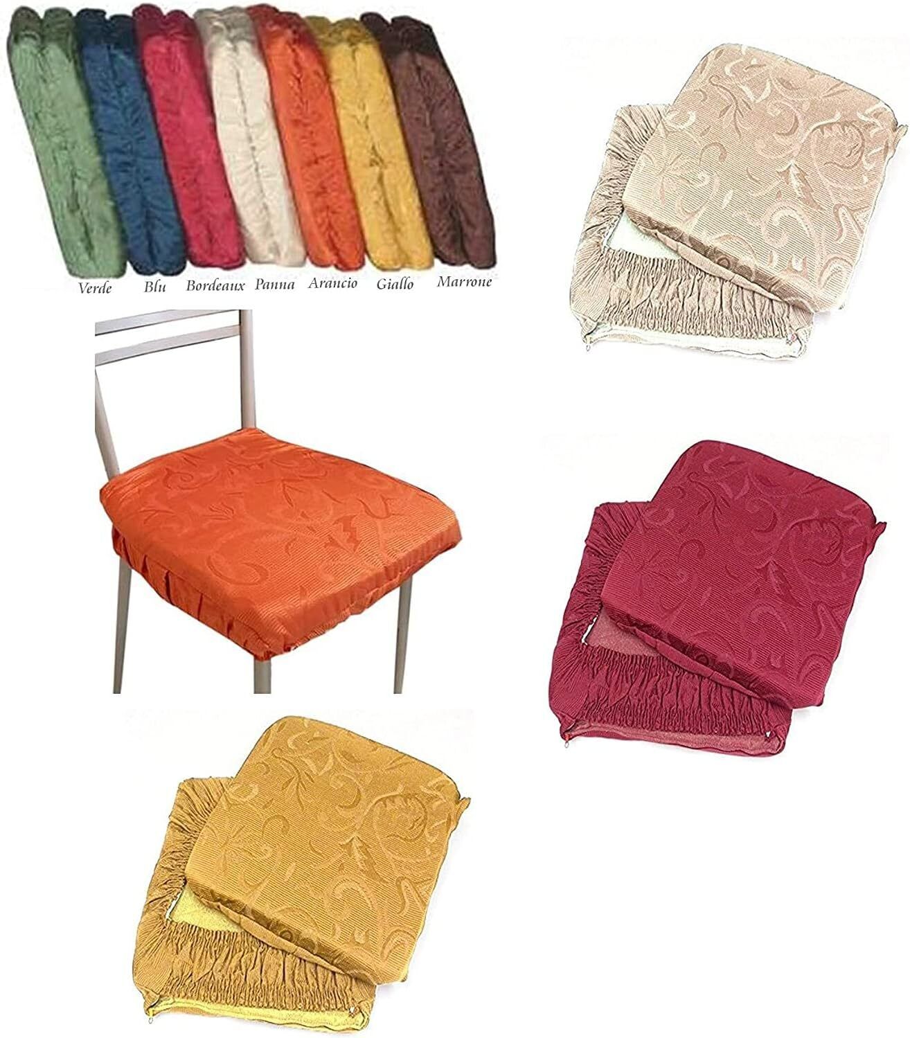 Coppia coprisedia, cuscino imbottito, tinta unita, tessuto jacquard. Semplici, graziosi, morbidi al tatto rendono elegante la tua sedia in qualsiasi ambiente. Dimensione 40x40 cm con bordi elasticizzati, con calzata dallo schienale che rendono ottimale l'aderenza alla sedia. Tessuto esterno tessuto jacquard 100% poliestere imbottitura 100% polipropilene.