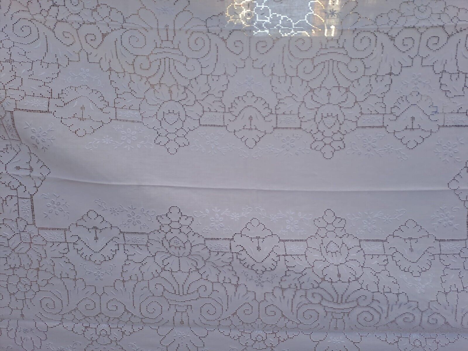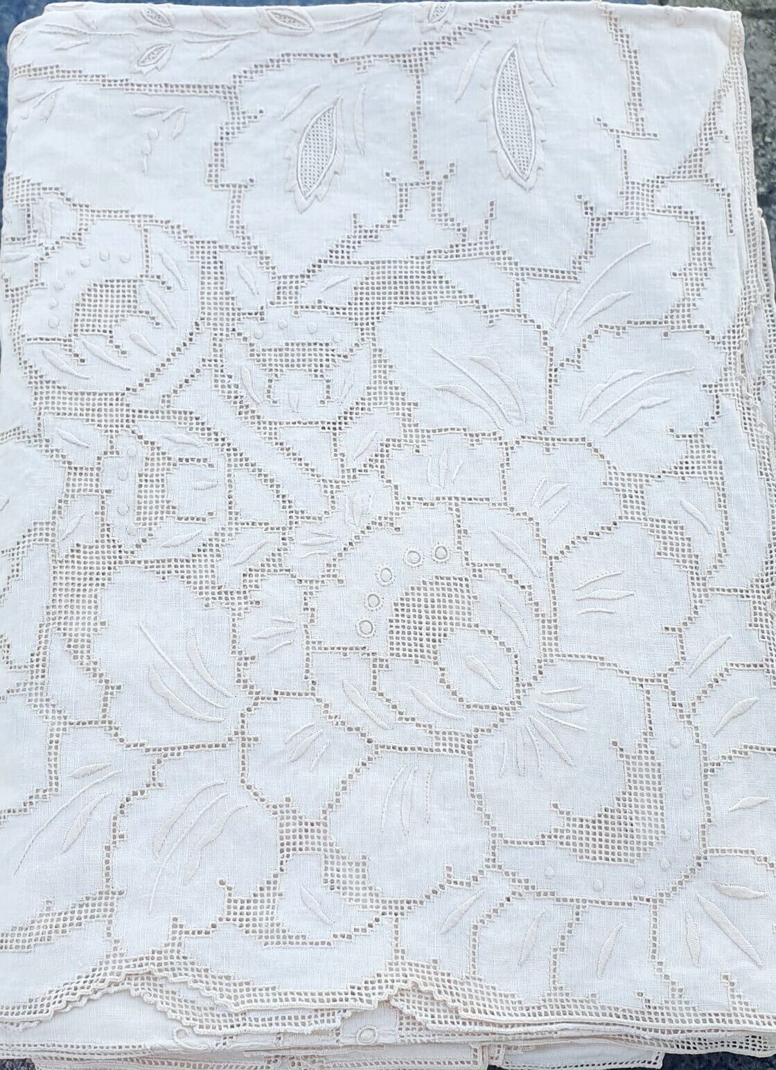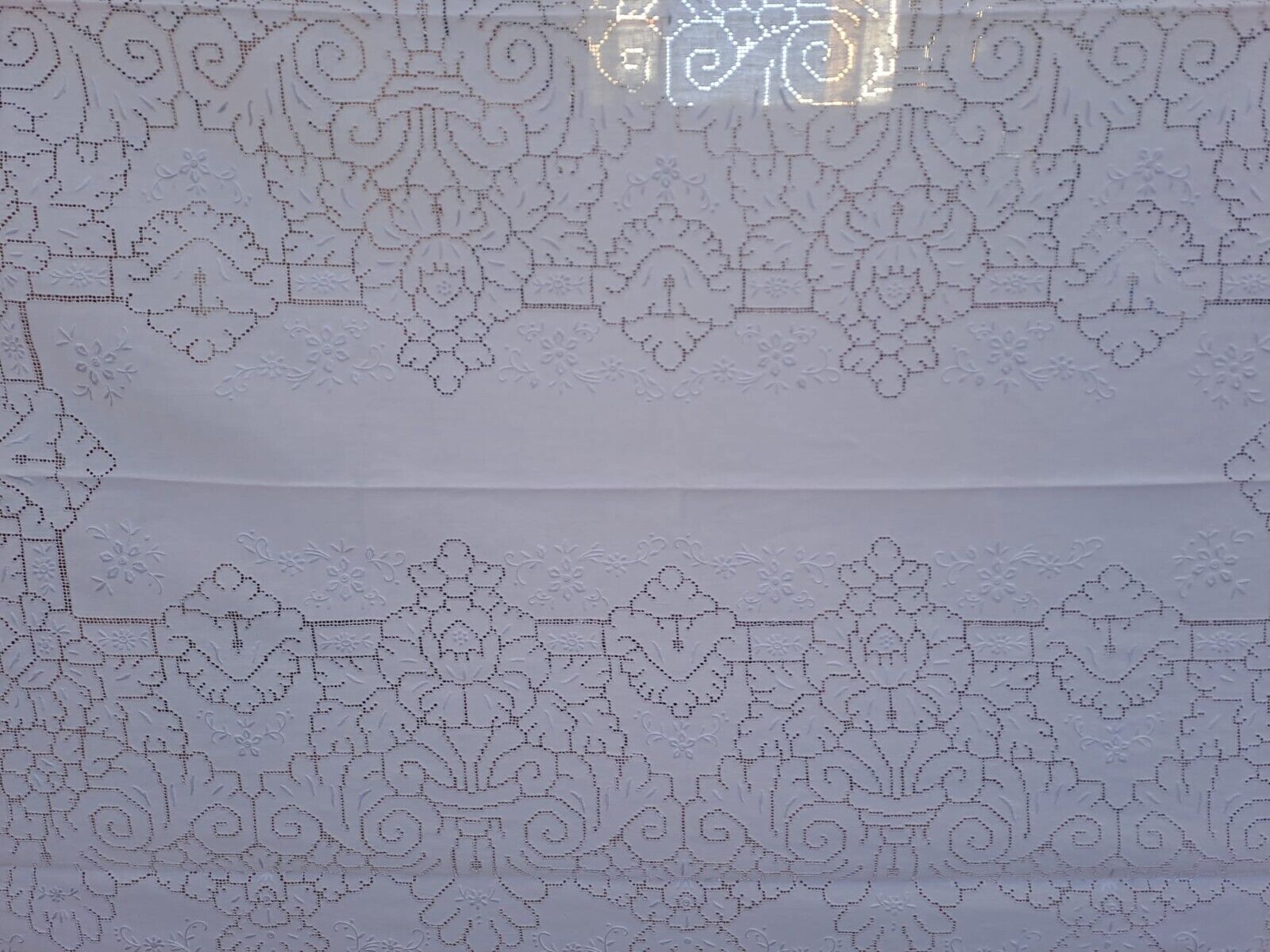 Servizio da tavola in puro lino ricamato a mano con un elegante e delicato ricamo sfilato siciliano. Il colore disponibile è l'ecrù.