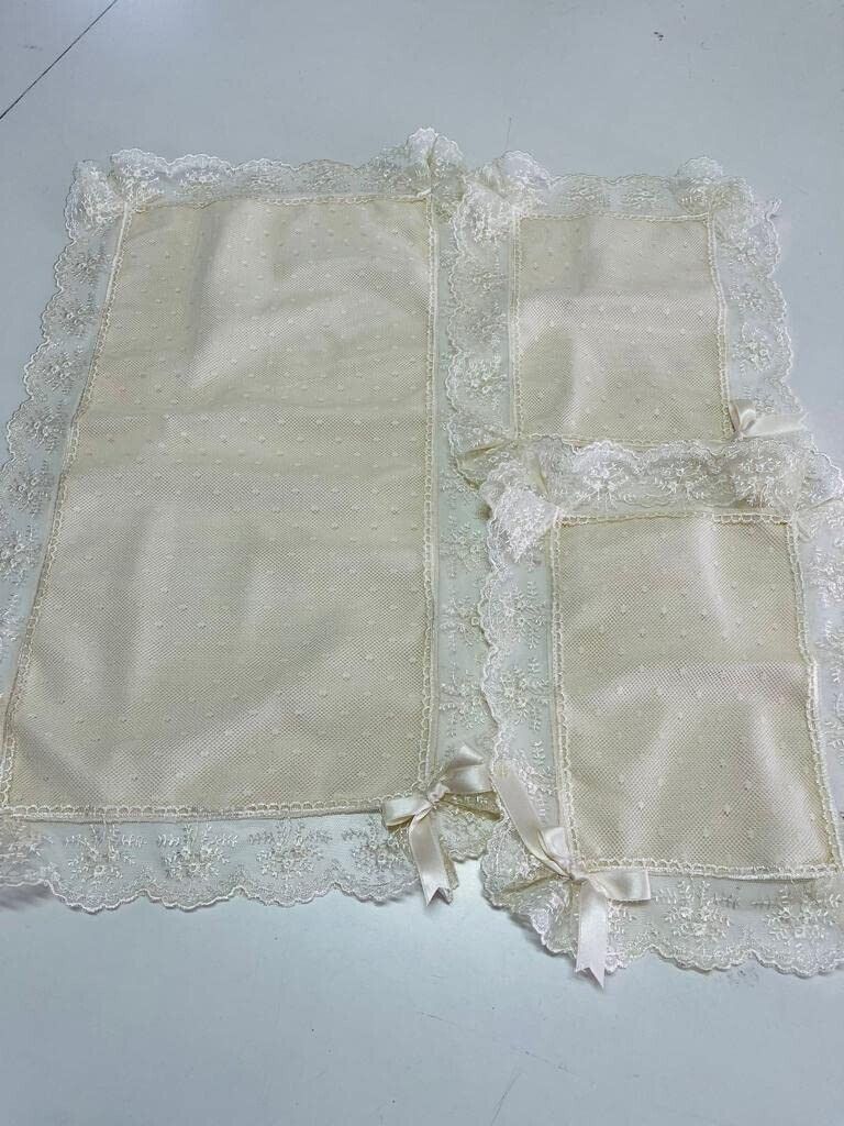 Centro 3 pezzi di centrini con un elegante ricamo pizzo valencienne ideale per qualsiasi tipo di arredamento, disponibile in tre forme: rettangolare - ovale - a punta - quadrato.