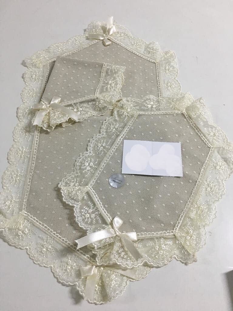 Centro 3 pezzi di centrini con un elegante ricamo pizzo valencienne ideale per qualsiasi tipo di arredamento, disponibile in tre forme: rettangolare - ovale - a punta - quadrato.