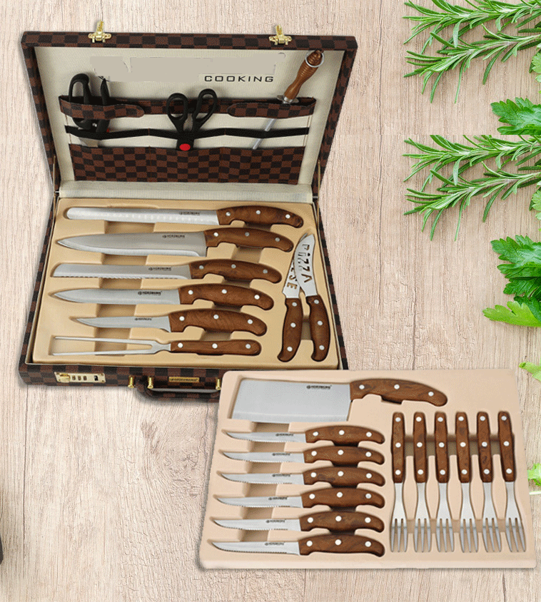 Considerate, anche come un regalo. Questo set comprende 24 pezzi, ognuno dei quali è stato progettato per soddisfare diverse esigenze culinarie. Da un assortimento di coltelli a un forchettone da carne, posate da bistecca e un acciaino per affilare, ogni componente è dotato di manici ergonomici in legno, che garantiscono una presa comoda e controllata durante la preparazione dei pasti.