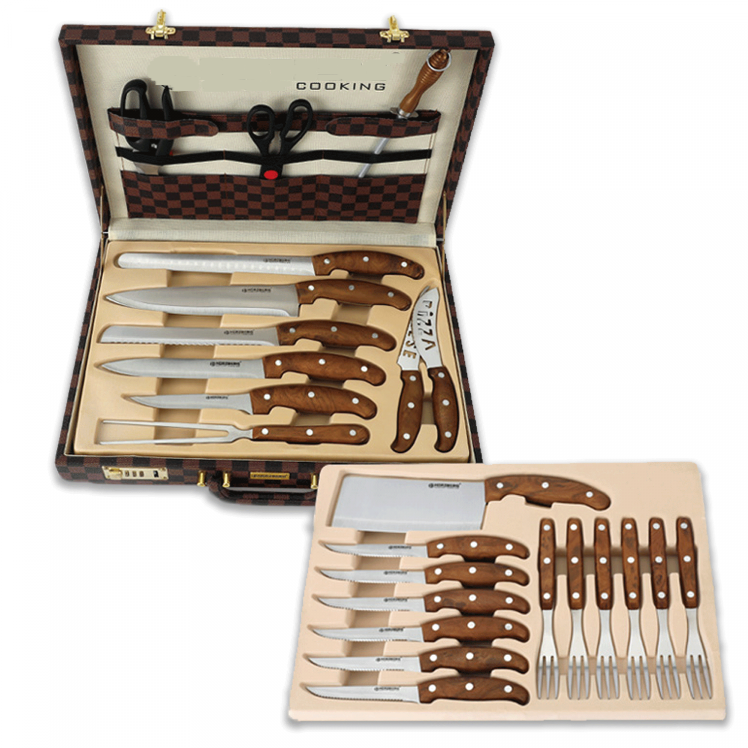 Non è un semplice set di coltelli, ma un'elegante design a scacchi marrone, contenuto in una robusta valigetta con struttura in alluminio, aggiunge un tocco di stile alla vostra cucina. Ma il set non si limita all'estetica, bensì alla funzionalità. Questi coltelli sono adatti a un'ampia gamma di piatti, dal pollame al manzo, dal pesce alle verdure. Le impugnature ergonomiche garantiscono il comfort durante l'uso prolungato, rendendo il vostro viaggio culinario un vero piacere.
