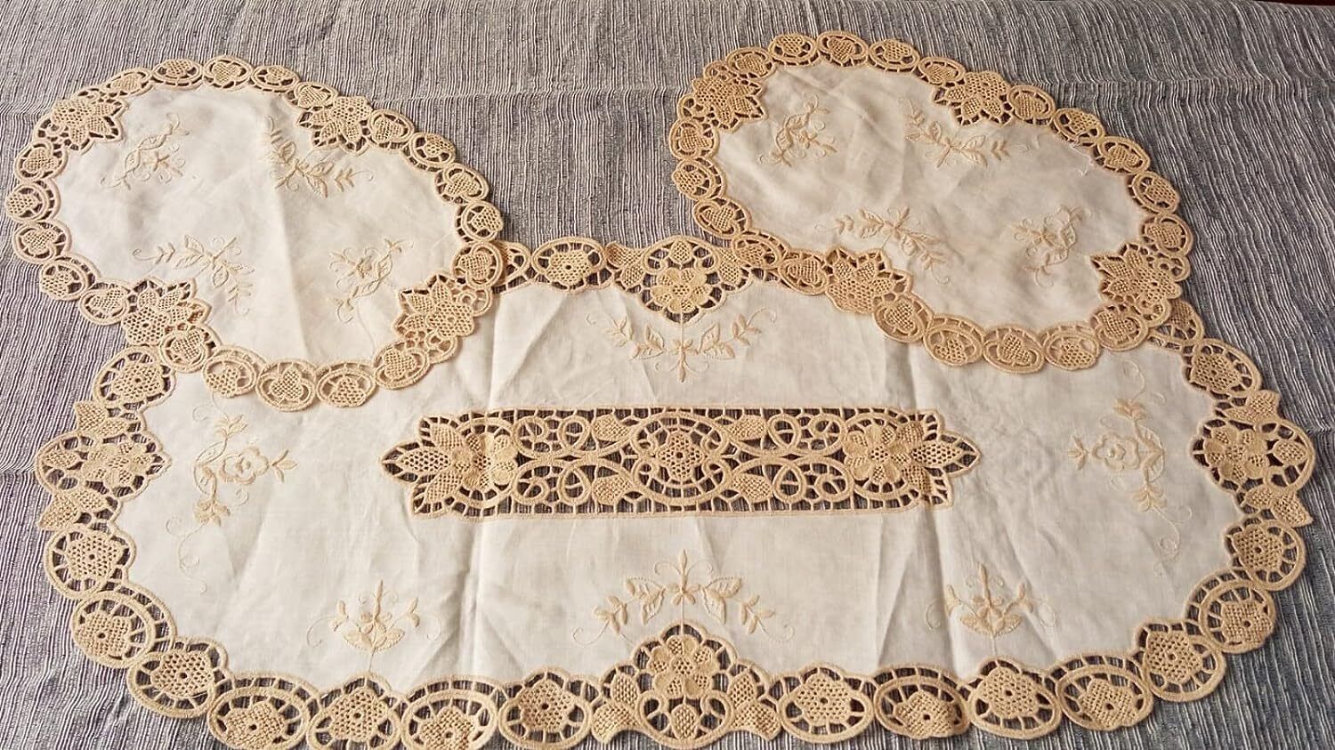 Completo centro ovale 3 pezzi in puro Lino ricamati al Burano.