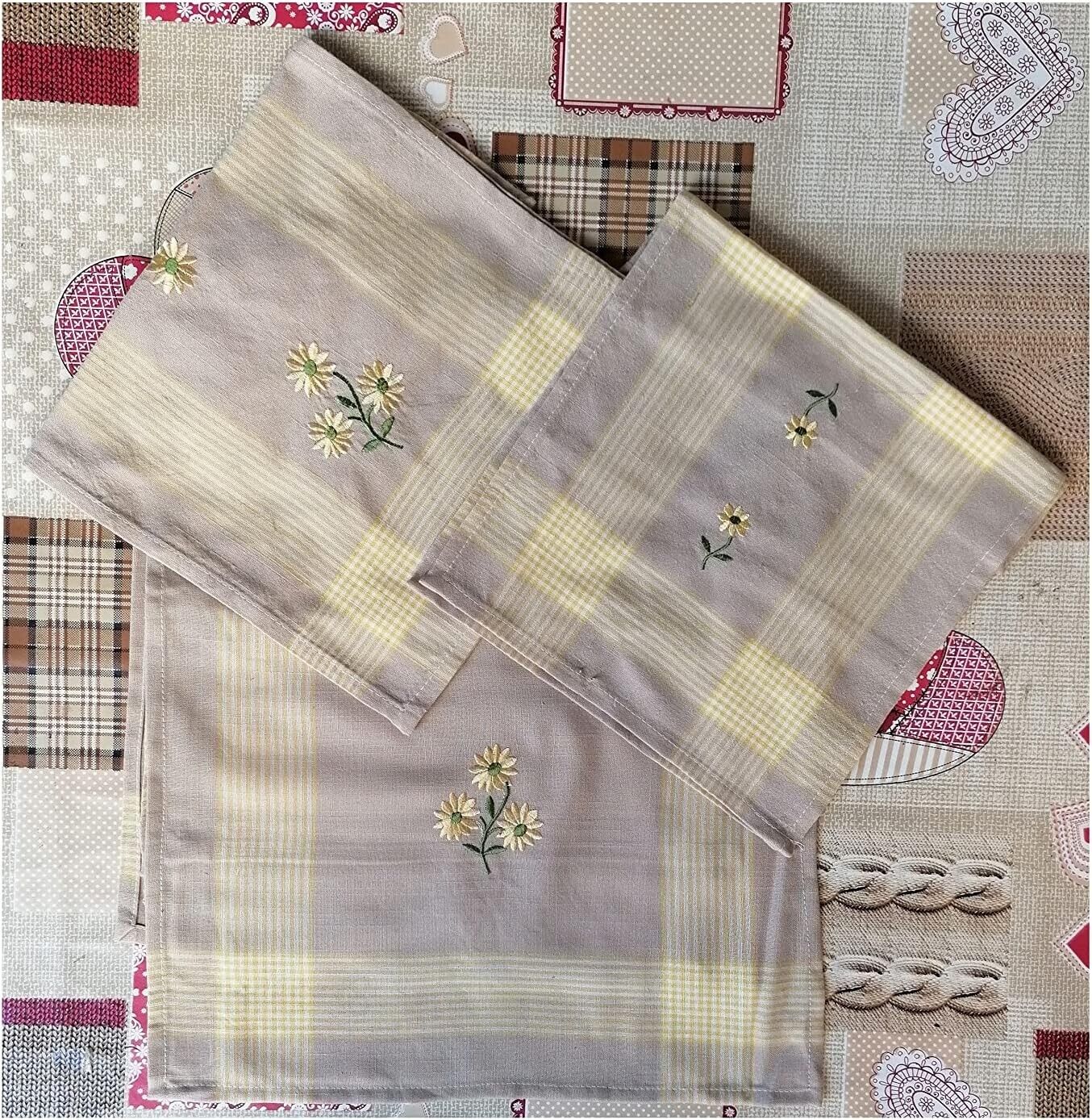 Elegante e ricercati tris di centrini, in lino con orlo a giorno ricamo a mano, composto da un centro grande 90x40cm e due centrini più piccoli 30x40cm.