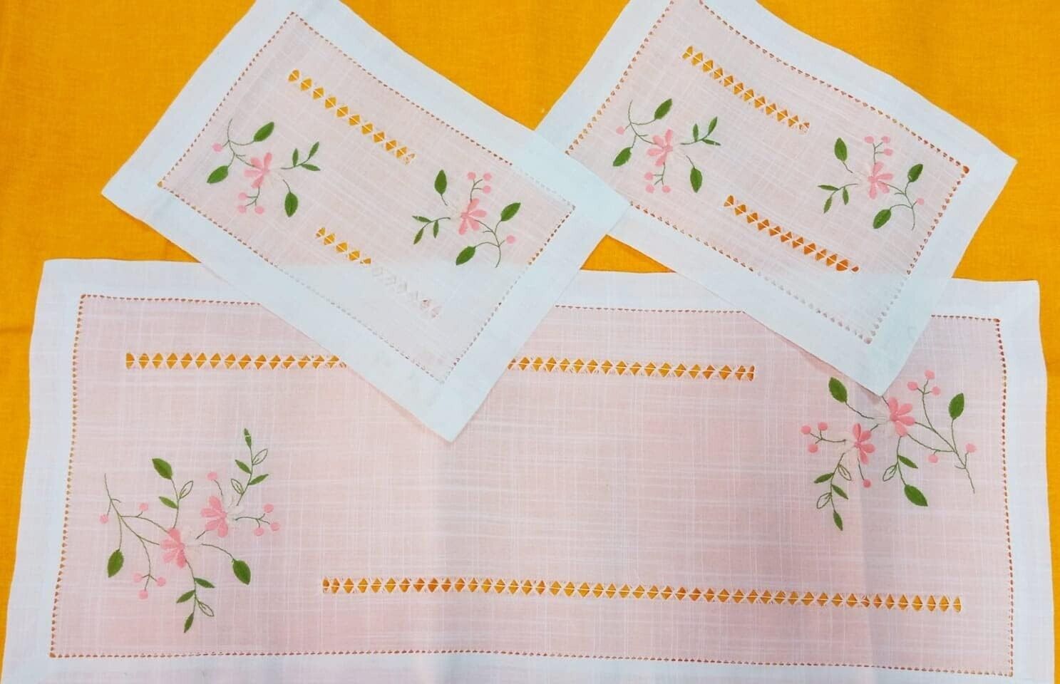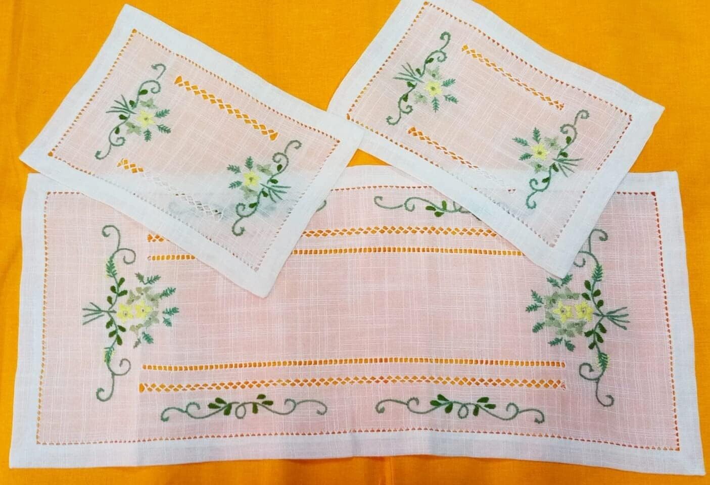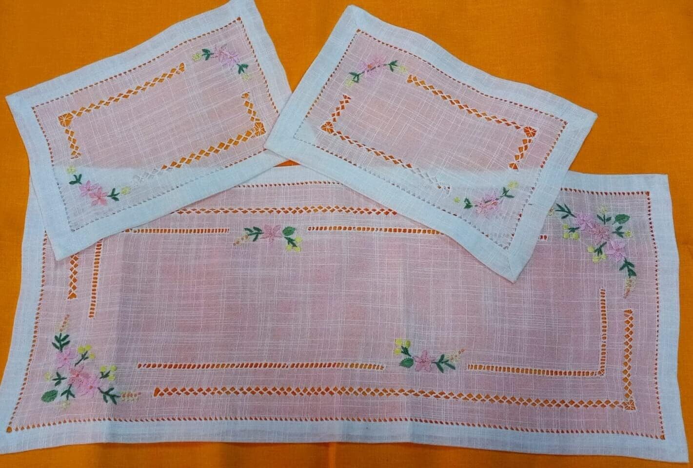 Elegante e ricercati tris di centrini, in lino con orlo a giorno ricamo a mano, composto da un centro grande 90x40cm e due centrini più piccoli 30x40cm.