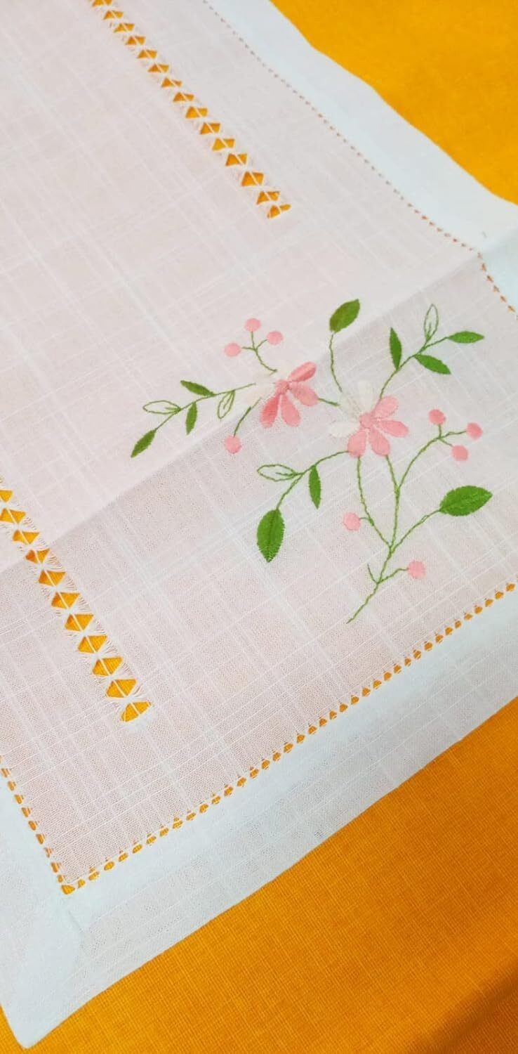 Elegante e ricercati tris di centrini, in lino con orlo a giorno ricamo a mano, composto da un centro grande 90x40cm e due centrini più piccoli 30x40cm.