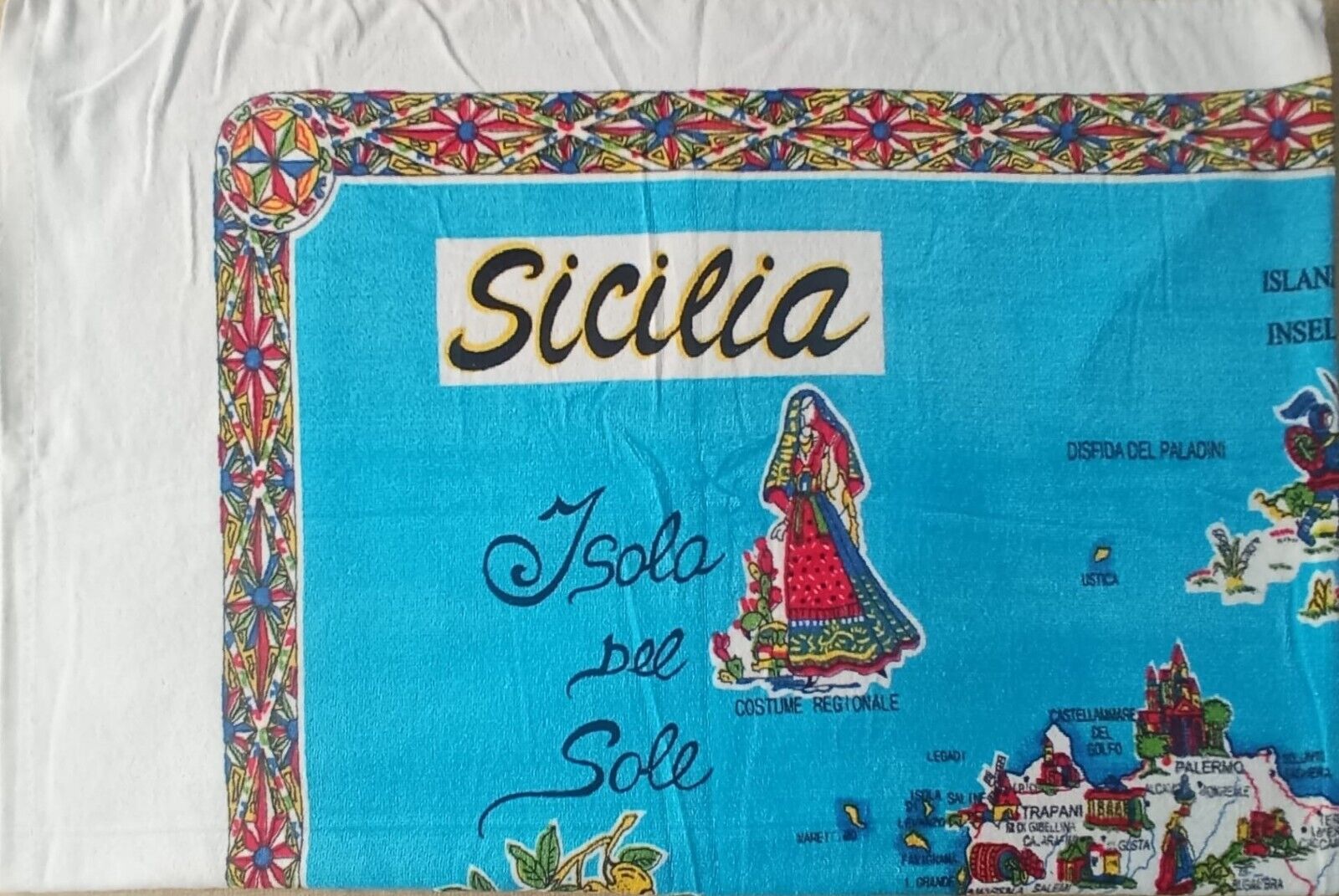 Il telo, misura cm 90 x 160, con la Sicilia stampata in grande dove sono raffigurati i più importanti monumenti e simboli della Sicilia.