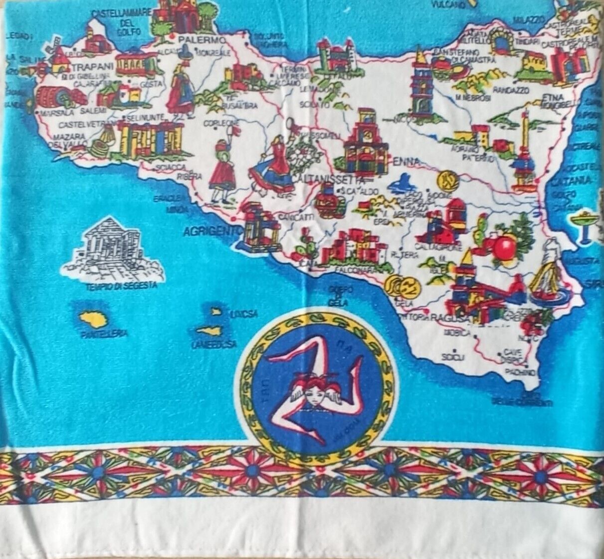 Il telo, misura cm 90 x 160, con la Sicilia stampata in grande dove sono raffigurati i più importanti monumenti e simboli della Sicilia.