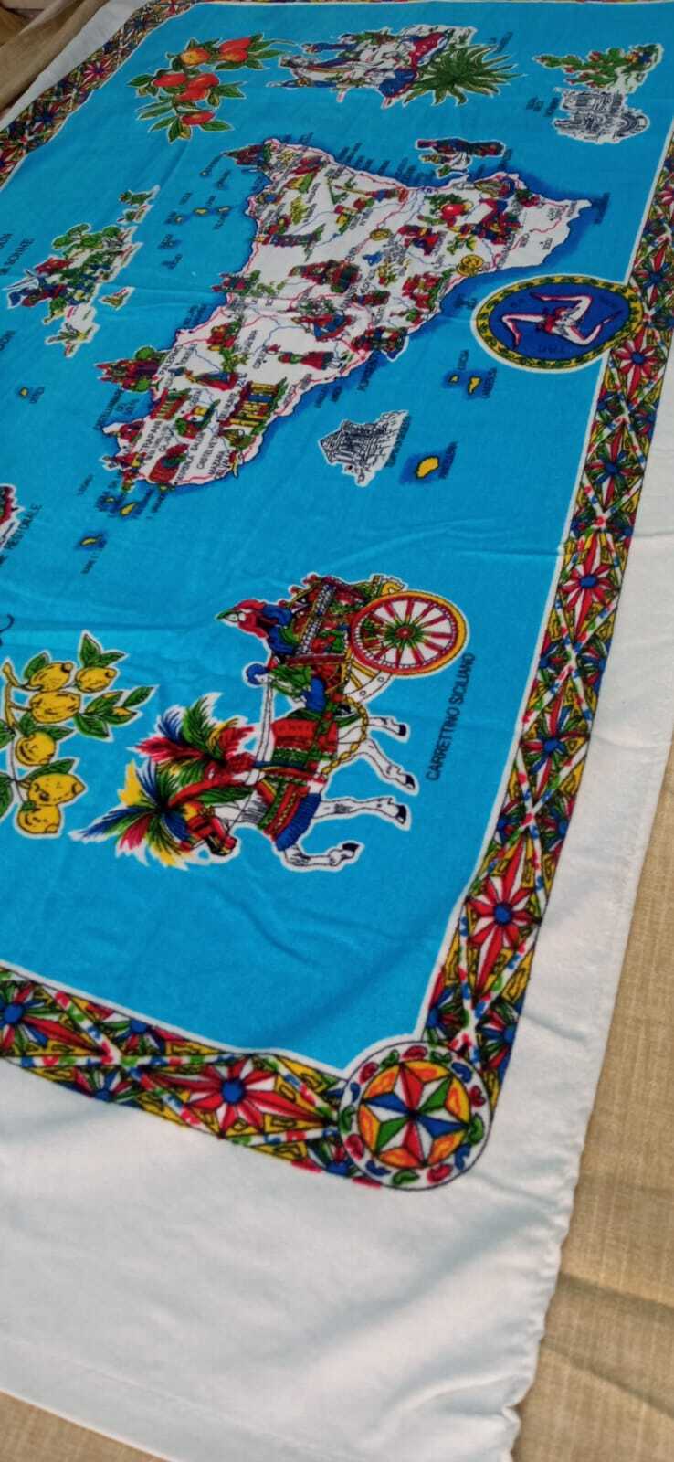 Il telo, misura cm 90 x 160, con la Sicilia stampata in grande dove sono raffigurati i più importanti monumenti e simboli della Sicilia.