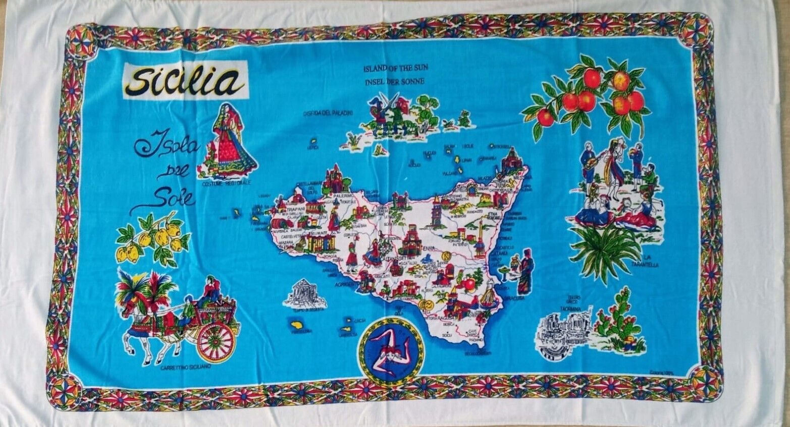 Il telo, misura cm 90 x 160, con la Sicilia stampata in grande dove sono raffigurati i più importanti monumenti e simboli della Sicilia.