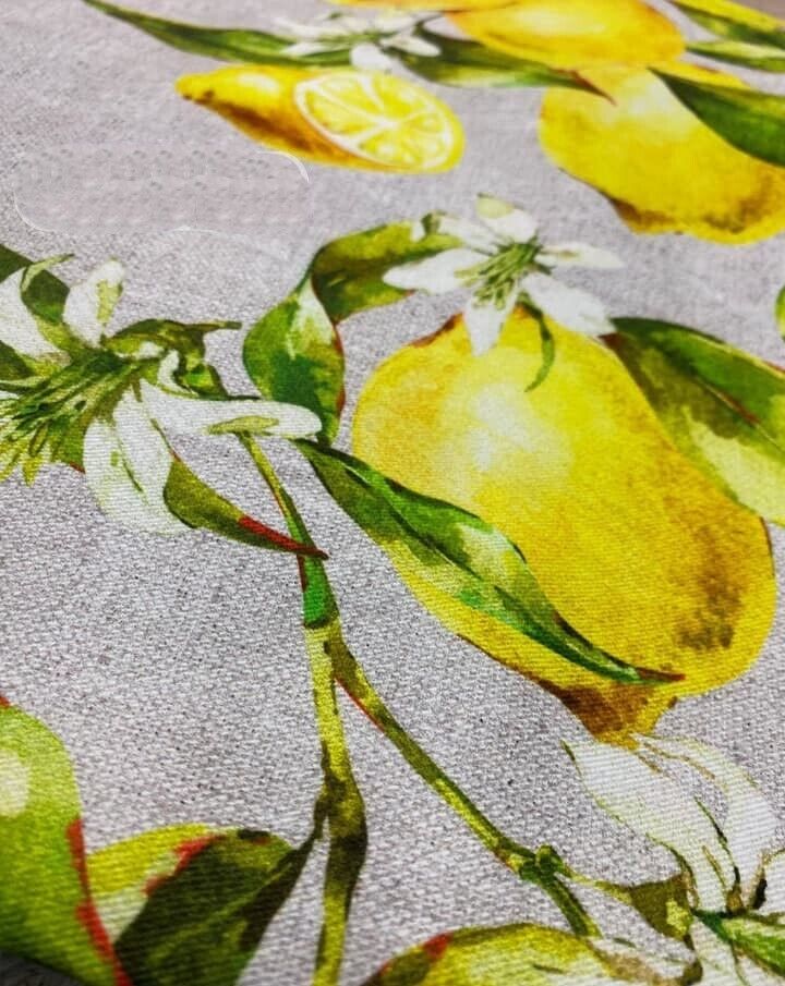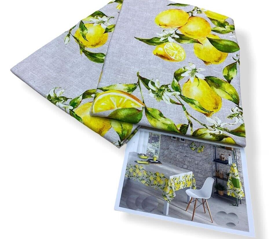 Tovaglia da tavola x12 persone, misura 140x250cm, in tessuto twill con fantasia limoni. La tovaglia è interamente prodotta, realizzata e lavorata artigianalmente in Italia. Presenta una qualità alta e dona un tocco di eleganza e ricercatezza al tuo ambiente. Grazie alla particolare tessitura obliqua, il twill presenta una trama robusta ed è capace di mantenere più a lungo la stiratura, essendo quindi meno soggetto alle pieghe. Lavabile in lavatrice. Made in Italy.