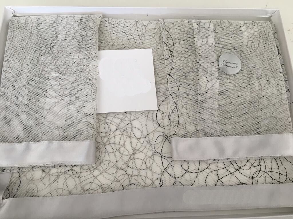 Tris di centrini, organza con bordo in raso, composto da un centro grande 40x70cm e due centrini più piccoli 30x40cm. Realizzati con materiale di alta qualità Colore disponibile in grigio.