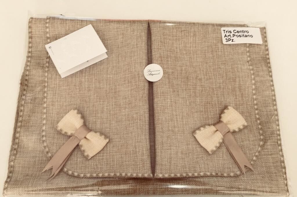 Elegante tre pezzi di centrini in tessuto Juta rifinito con smerlino. Il tris è composto da un centro grande 40x70cm e due centrini più piccoli 30x40cm. Realizzati con materiale di alta qualità. Disponibili in vari colori quali: arancio, bordeaux, blu, , corda, grigio, marrone, nero, oro, panna, rosso e verde.