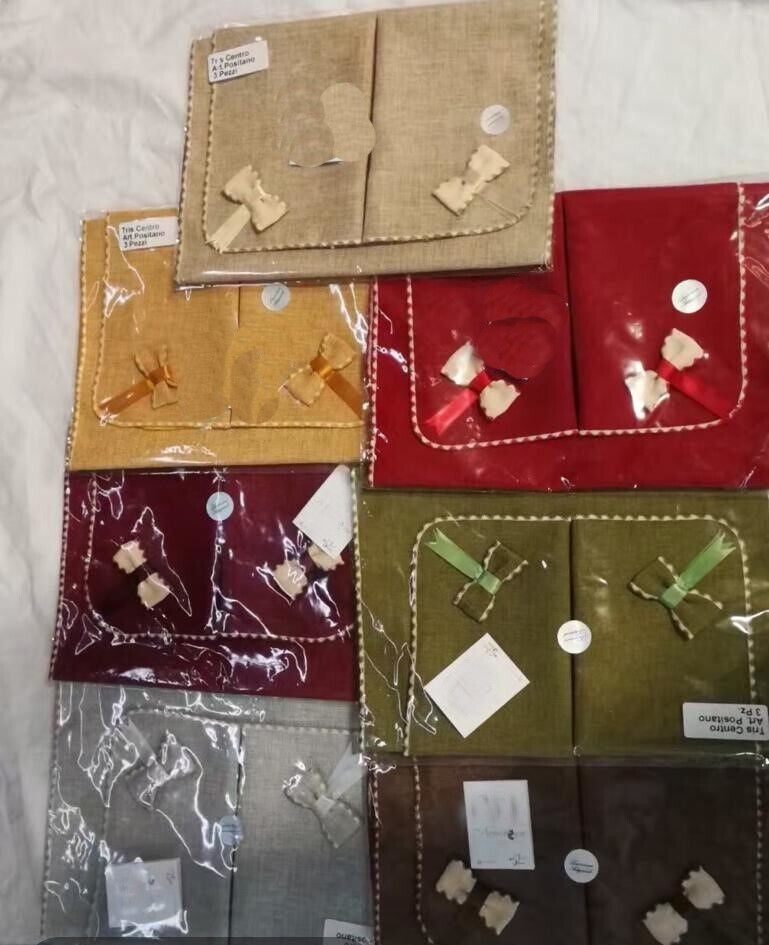 Elegante tre pezzi di centrini in tessuto Juta rifinito con smerlino. Il tris è composto da un centro grande 40x70cm e due centrini più piccoli 30x40cm. Realizzati con materiale di alta qualità. Disponibili in vari colori quali: arancio, bordeaux, blu, , corda, grigio, marrone, nero, oro, panna, rosso e verde.