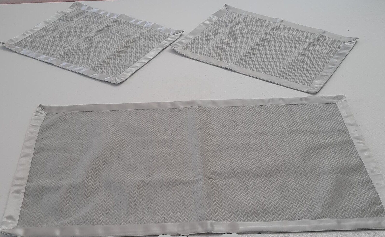 Elegante e ricercato tris di centrini composto da un centro grande 40x70cm e due centrini più piccoli 30x40cm. Realizzati con materiale di alta qualità. Disponibili in vari colori quali: grigio, biscotto, panna.