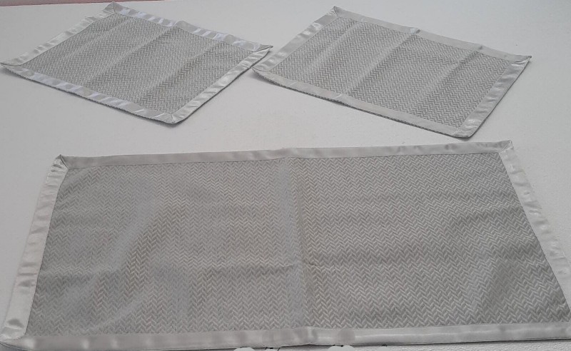 Elegante e ricercato tris di centrini composto da un centro grande 40x70cm e due centrini più piccoli 30x40cm. Realizzati con materiale di alta qualità. Disponibili in vari colori quali: grigio, biscotto, panna.