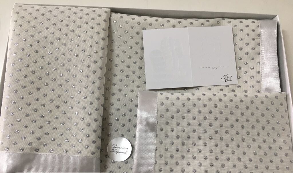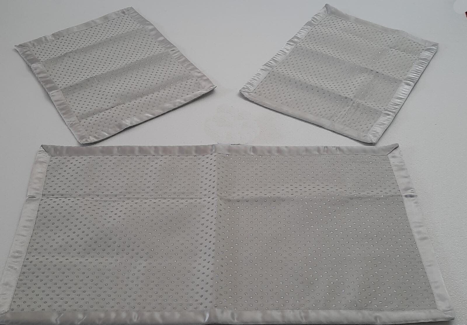 Elegante Tris di centrini in tinta unita a pois con bordo in raso composto da un centro grande 40x70cm e due centrini più piccoli 30x40cm. Realizzati con materiale di alta qualità. Disponibili nel colore grigio.