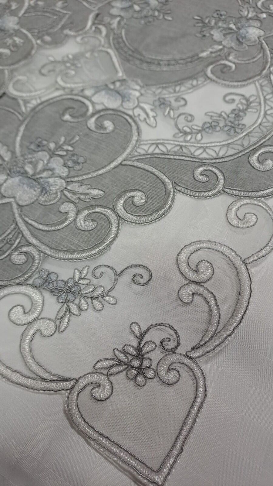 Elegante e ricercato tris di centrini composto da un centro grande 89x42cm e due centrini più piccoli 43x30cm. Realizzati con materiale di alta qualità. Disponibile nel colore del grigio.