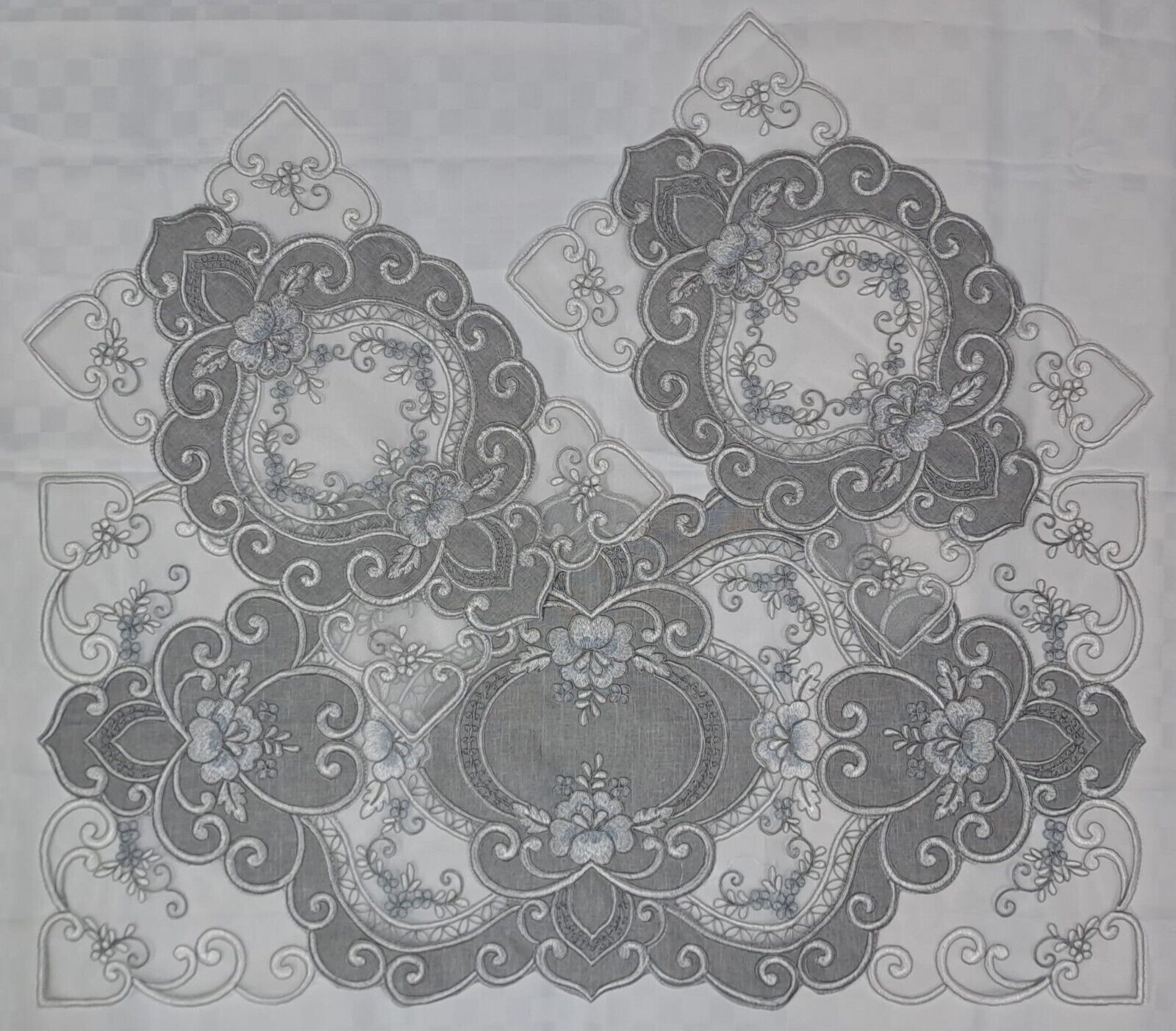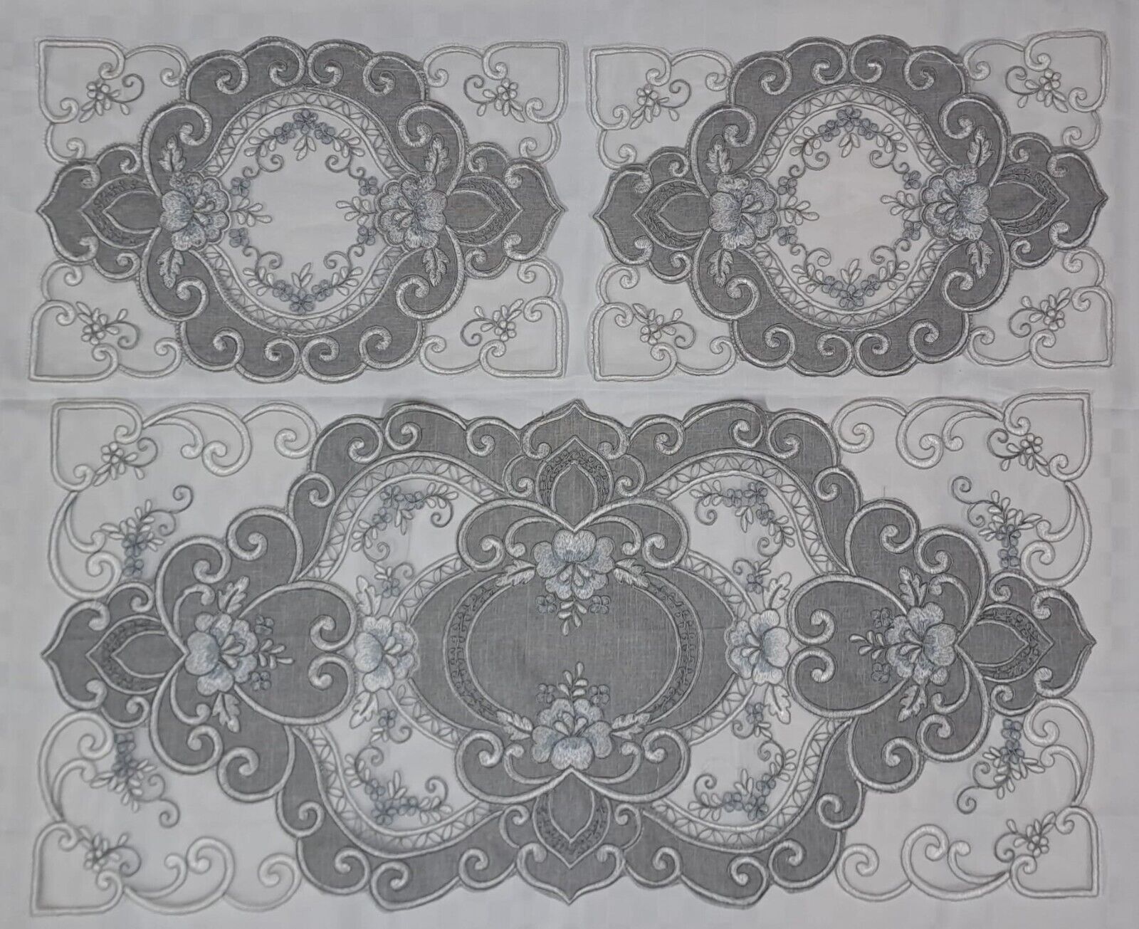 Elegante e ricercato tris di centrini composto da un centro grande 89x42cm e due centrini più piccoli 43x30cm. Realizzati con materiale di alta qualità. Disponibile nel colore del grigio.