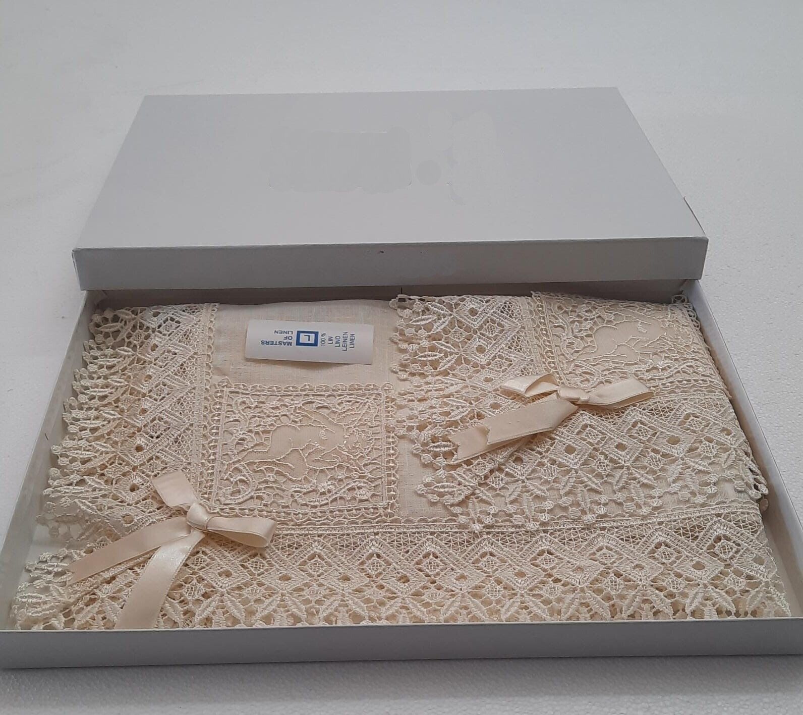Esclusivi centrini, lavorazione artigianale produzione interamente italiana, in tinta unita con bordo in pizzo con disegno di un angelo ad un angolo, si abbinano sia ad un arredamento classico che moderno. Il set di centrini è perfetto in camera da letto ma anche sui mobili, su una consolle o su un tavolo da salone. Diverse lunghezze da adattare in qualsiasi arredamento dal tavolo da pranzo al tavolo da salotto, dalla camera da letto al salone. Ideali per qualsiasi tipo di arredamento.