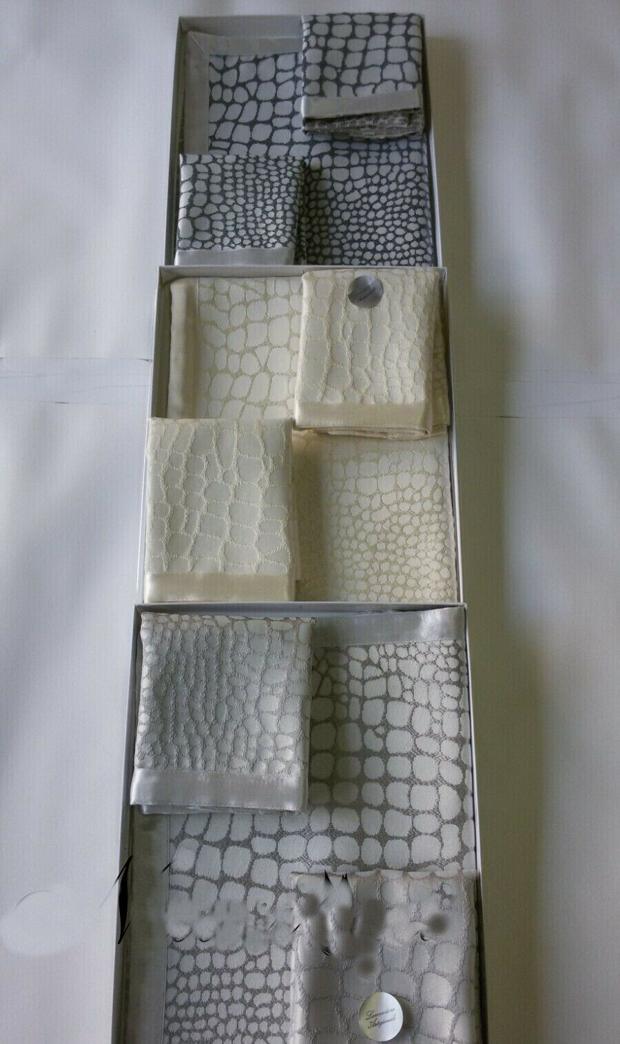 Elegante e ricercato tris di centrini composto da un centro grande 40x70cm e due centrini più piccoli 30x40cm. Il tris di centrini è in raso a fantasia. Disponibili in vari colori quali: biscotto, gianduia, grigio chiaro, grigio scuro, grigio perla e panna.