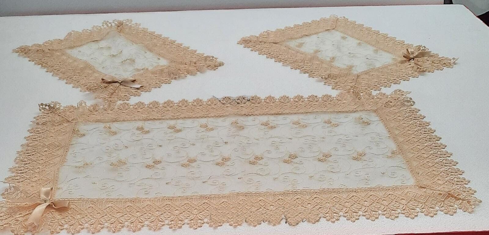 Elegante e ricercato tris di centrini, in pizzo macramé, composto da un centro grande 40x70cm e due centrini più piccoli 30x40cm. Realizzati con materiale di alta qualità. Disponibili in vari colori quali: biscotto, panna. ART. DESIREE