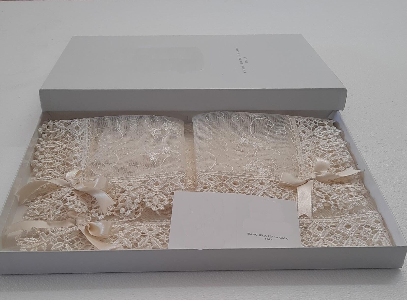 Esclusivi centrini, lavorazione artigianale produzione interamente italiana, in tinta unita con bordo in pizzo macramé si abbinano sia ad un arredamento classico che moderno. Il set di centrini è perfetto in camera da letto ma anche sui mobili, su una consolle o su un tavolo da salone. Diverse lunghezze da adattare in qualsiasi arredamento dal tavolo da pranzo al tavolo da salotto, dalla camera da letto al salone. Ideali per qualsiasi tipo di arredamento.