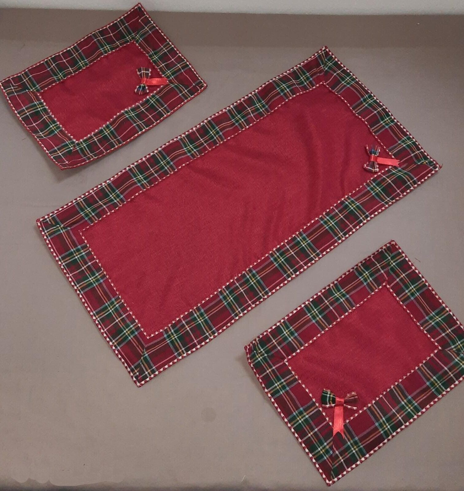 Elegante e ricercato tris di centrini composto da un centro grande 40x70cm e due centrini più piccoli 30x40cm. Realizzati con materiale di alta qualità. Disponibili nel colore del rosso.