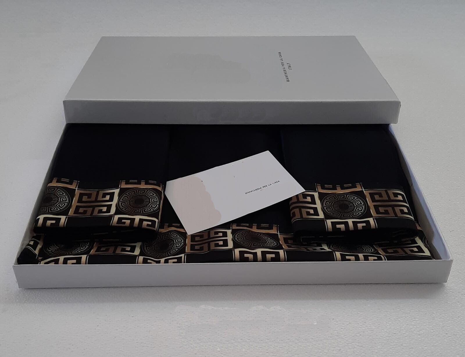 Elegante e ricercato tris di centrini composto da un centro grande 40x70cm e due centrini più piccoli 30x40cm. Realizzati con materiale di alta qualità. Disponibili in vari colori quali: grigio/grigio, grigio/oro, nero/grigio e nero/oro.