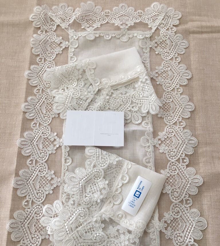 Elegante e raffinato tris di centrini in puro lino 100% composto da un centro grande 40x70cm e due centrini più piccoli 30x40cm. Realizzati con materiale di alta qualità. Disponibili nelle varianti i colore bianco e panna. La nuance neutra consente facilità di accostamento con altri complementi come cuscini, tovaglie e tovagliette. Art. Perla